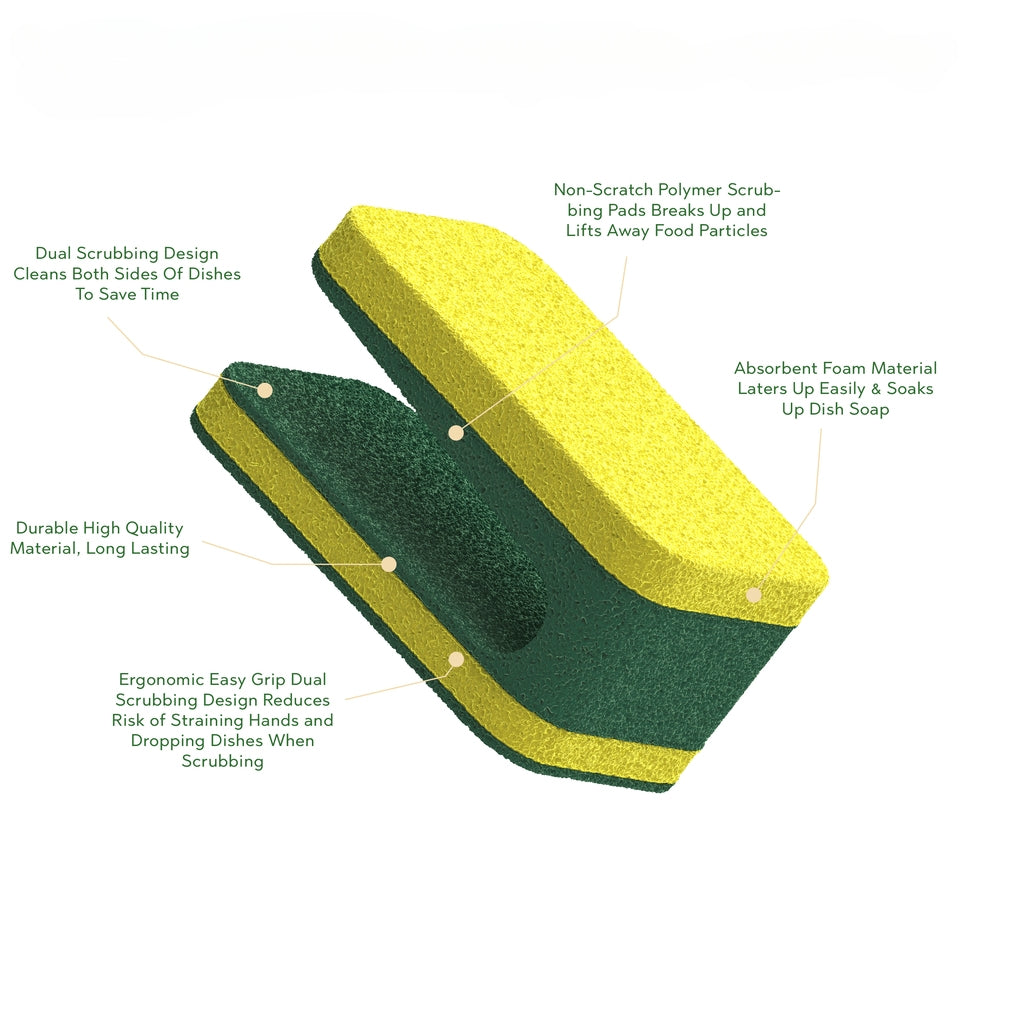 Ergonomic Easy Grip Dual Scrubbing Design Reduces Risk of Straining Hands and Dropping Dishes When Scrubbing.
